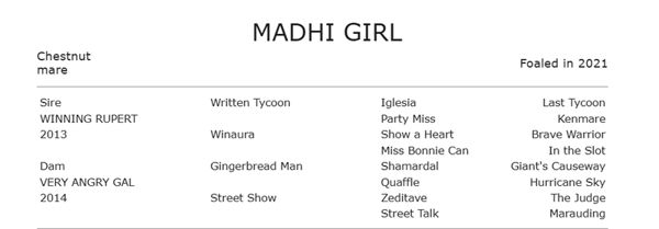 Madhi Girl was the second foal from her dam Very Angry Gal (Gingerbread Man) and is the first to earn black type for the mare, who was also trained by Miller and was a juvenile winner from only four race starts. Very Angry Gal has produced five consecutive  fillies, all her foals.