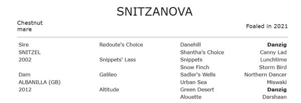 Snitzanova is a rare Snitzel bred to stay being from blue blood Galileo mare Albanilla (GB) and her third dam Alouette has spawned a massive dynasty of Group winning stayers for Lanwades Stud headed by Arc queen Alipinista with success in our part of the world for imported stayers such as Kingswood (GB) and Alalcance (GB).