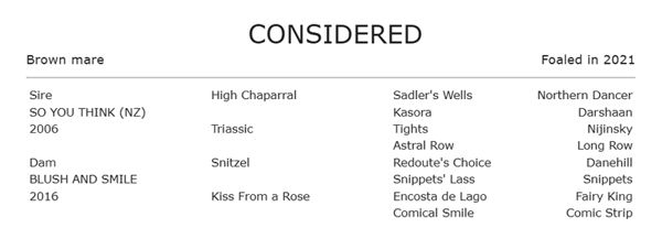 By outstanding sire So You Think, Considered is a three-quarter sister-in-blood to Group I Tatts Tiara winner Palaisipan, who won over $1.1million in prizemoney before being sold to Katsumi Yoshida to go to stud in Japan.