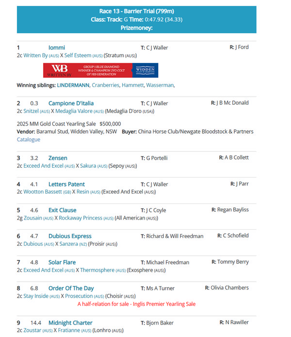 Also by Written By is Lindermann’s half-brother Iommi, who went more than OK at his first trial and went even better to win this one. Trained by Chris Waller as is his famous sibling, Iommi won by a neck over his stablemate Campione D’Italia, who hit the line stylishly with James McDonald in the saddle.