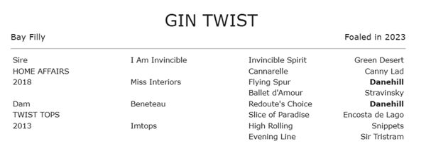 Gin Twist is also linebred to Lunchtime, Sir Ivor and Never Bend, all sex balanced.