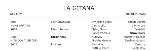 I love La Gitana's sex balanced inbreeding to Nureyev’s champion sprinter Stravinsky and his G1 winning dam Fire The Groom and the way it enhances her linebreeding to Home Affair's ancestress Fanfreluche, especially through her grand daughter Exigent - the sex balanced duplications of Northern Dancer, Native Dancer, Mr Prospector and Wild Risk thus created is a recipe for superior class and speed.