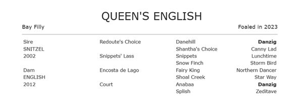 She’s got the posh pedigree to do justice to the name, being one of the last daughters of breedshaper Snitzel from the freakish Encosta de Lago daughter English who won the G2 Riesling and was a narrow runner up in Vancouver's Golden Slipper at two, before training on to a magnificent WFA career.