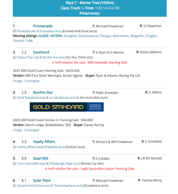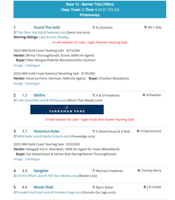 Another first day trialler with a sibling in an upcoming sale is the Ron Quinton trained Too Darn Hot (GB) filly Found the Gold, who found the line well in her heat to win by a length.