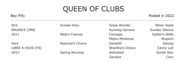 The athletic Queen Of Clubs is bred on Maurice's most successful Australian cross, Redoute's Choice - responsible for his freakish G1 Guineas / dual Derby champion Hitotsu among his five stakes winners bred this way.