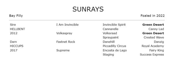 Sunrays was not offered at auction and is retained by breeder Peter Moran who has had much success with her family . She is the first living foal from the unraced Hiccup ( Fastnet Rock) a daughter of the amazing Success Express mare Staging.